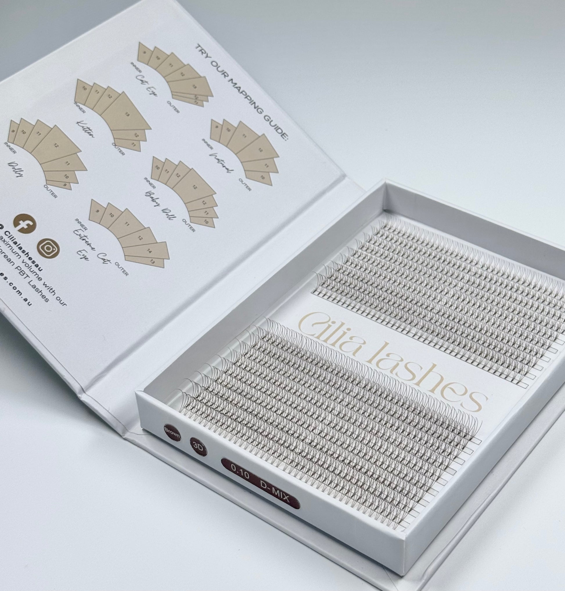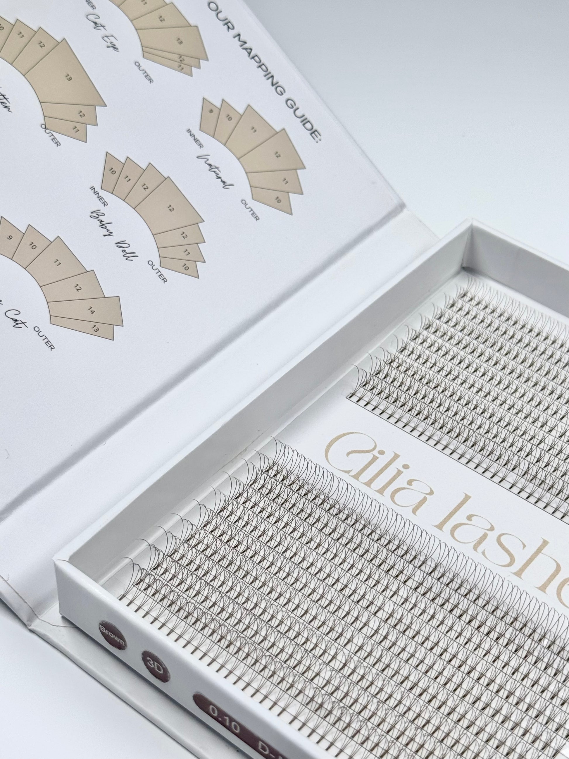 Cilia pre-made lashes are 100% hand crafted and created from the purest Korean PBT materials, ensuring they remain untouched by harmful chemicals. This purity allows them to form a superior bond with lash adhesives, maintain their natural darkness and lasting curls without breakage. Our fans feature a slim, pinched base, are soft and flexible providing a light weight and comfortable feel. Cilia packages all our lashes in completely recyclable boxes.