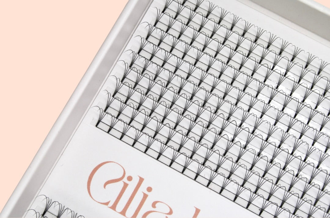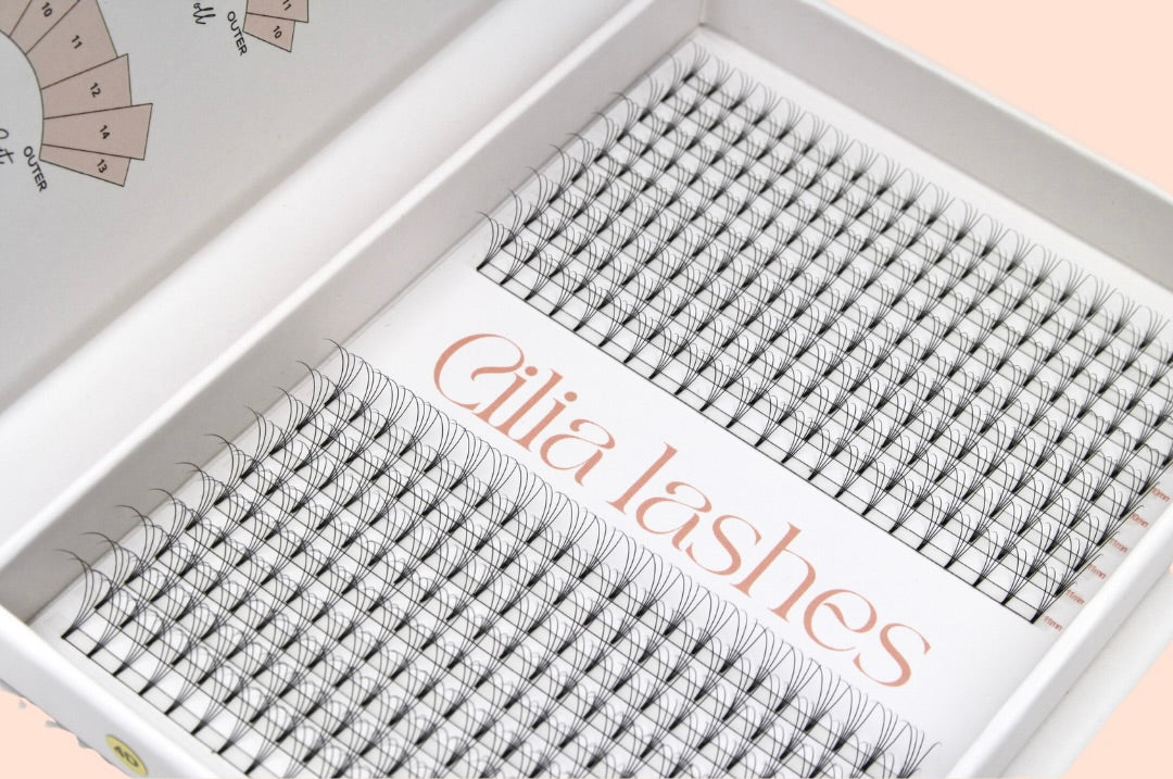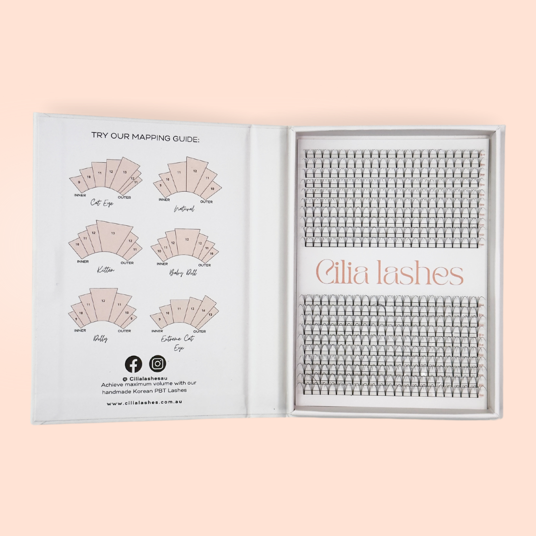Cilia pre-made lashes are 100% hand crafted and created from the purest Korean PBT materials, ensuring they remain untouched by harmful chemicals. This purity allows them to form a superior bond with lash adhesives, maintain their natural darkness and lasting curls without breakage. Our fans feature a slim, pinched base, are soft and flexible providing a light weight and comfortable feel. Cilia packages all our lashes in completely recyclable boxes.